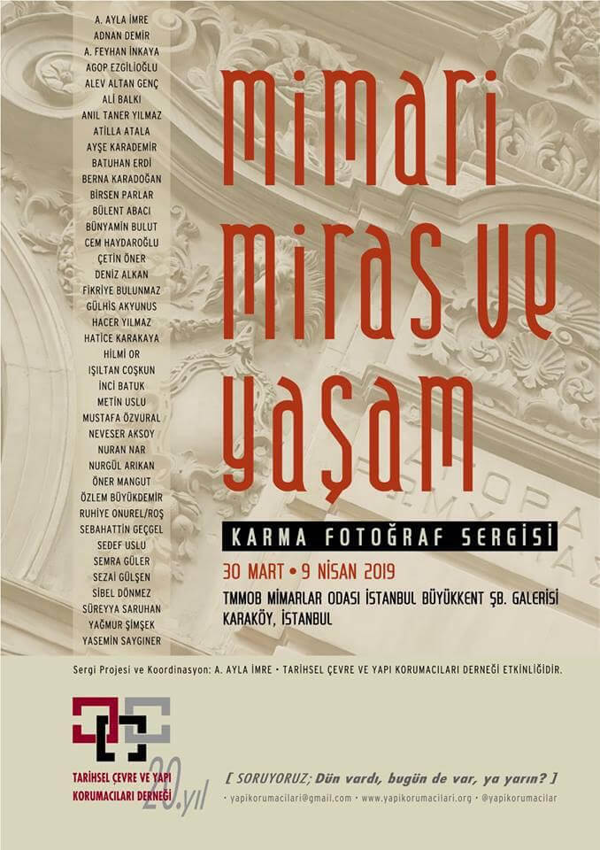 Tarihsel Çevre ve Yapı Korumacıları Derneği (TÇYKD), ‘Eski Eser Yapılarda Restorasyon Uygulamaları Semineri’ ve 20. yıl etkinlikleri kapsamında ‘Mimari Miras ve Yaşam’ konulu karma fotoğraf sergi açılışını 30 Mart Cumartesi günü TMMOB Mimarlar Odası İstanbul Büyükkent Şubesi Karaköy’de yapacak.