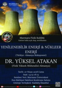 Marmara Üniversitesi Fizik Kulübü'nün 27 Nisan Cuma günü düzenleyeceği seminerin konuğu Radyasyon Fizikçisi Dr. Yüksel Atakan (Almanya) olacak. Üç bölümden oluşan seminerin sonunda görüşlere yer verilecek.