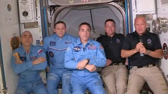 Amerikalı astronotlar Doug Hurley ve Bob Behnken’i taşıyan SpaceX’in uzay aracı Crew Dragon, Uluslararası Uzay İstasyonu’yla kenetlendi, astronotlar Crew Dragon’dan Uluslararası Uzay İstasyonu’na sorunsuz bir şekilde geçti.