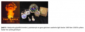 20. YY başlarında radyum’un katkı maddesi olarak kullanıldığı çeşitli madde ve malzemeler, ışın saçtıkları ve gece göründükleri için çok ilgi çekiyorlar. Bunlar arasında özellikle şunlar bulunuyor: Çukulatalar, çeşitli yiyecekler, su, çocuklara oyuncaklar, diş macunları, kozmetik kremler, pudralar, sağlık malzemeleri, romatizma, yorgunluk, zaafiyet ve kanser ilaçları, radyum, radon banyoları, radyumlu saatler, gece ışık saçan lambalar.