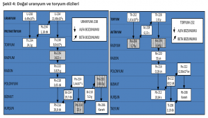 Yerkabuğunda uranyum, toryum ve başka doğal radyoaktif maddeler olduğunu, bunlardan radyoaktif bozunmayla başka elementlerin (izotopların) türediğini, bugün, biliyoruz. Uranyum ve toryum’dan türeyen elementler Şekil 4’de gösteriliyor.