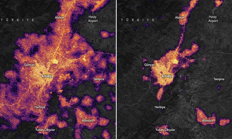 Amerikan Havacılık ve Uzay Dairesi (NASA), Hatay’ın deprem öncesi ve sonrasına ait yeni uydu görüntüleri paylaştı. Haritalar, NASA-NOAA Suomi NPP uydusundaki ‘Visible Infrared Imaging Radiometer Suite’ (VIIRS) sensöründen alınan verilere dayanmaktadır.
