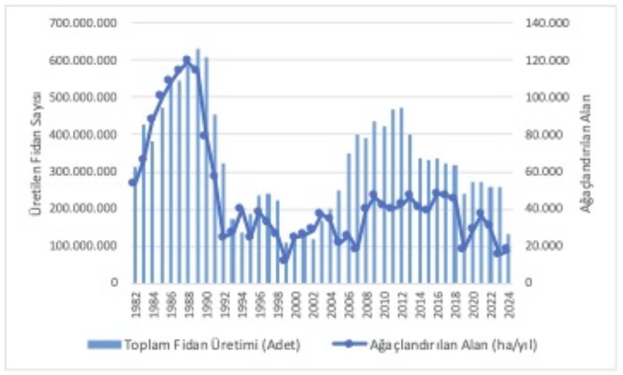 Şekil 2: Yıllara göre ağaçlandırılan alan ve üretilen fidanlık düzeylerinin değişimi