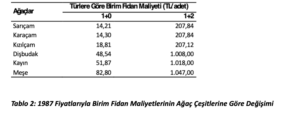 Ülkemizde ağaçlandırma çalışmalarının büyük artış gösterdiği seksenli yıllardaki birim fidan maliyetleri Tablo 2’de gösterilmiştir. Üç yaşında (1+2) tek bir meşe fidanı yetiştirmek için harcanan kaynakla yaklaşık beş çam fidanı yetiştirmek mümkündür. Üstelik 1+0 yani bir yıl çimlenme yastığında kalmış ve sökülüp ağaçlandırmaya sevk edilmiş çam fidanlarının tutma şansı vardır ve plantuvar dikimi gibi düşük dikim masrafları dikkate alındığında çamları ağaçlandırmada öne çıkarır. Ucuz ve çabuk yetişebilen fidanları, kolay ve az bütçeyle yapılabilen dikimi, gösterdiği yüksek artım ve oduna olan acil ihtiyaç, çam türlerini meşe cinsinin ve diğer türlerin önüne geçirmiştir.