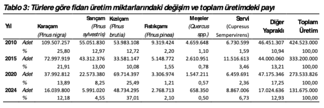 Ne yazık ki, yetiştirilen fidanların türlere göre dağılımını 2010 sonrası dönemde izlemek mümkündür. Tablo 3’den görüldüğü gibi, kızılçam dışında başka çamların da fidanı yetiştirilmektedir.