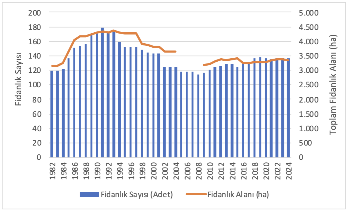 Orman ağaçları için en önemli tohum kaynağı, kamu mülkiyetindeki tohum meşcereleri ve tohum bahçeleridir. Orman fidancılığı, süs bitkilerine göre, çok fazla miktarda fidan üretimini gerektirir ki bu da geniş üretim alanlarına ihtiyaç duyar. Üstelik meşe veya diğer yapraklı türler ile fidanı güç yetişen ardıçlar gibi ibrelilerden yeterince üretmek isteniyorsa daha büyük ve uzmanlaşmış fidanlıklara ihtiyaç vardır. 1982 yılından günümüze orman fidanlıklarının sayıları ve toplam alan büyüklüğü Şekil 3’de gösterilmiştir. 1982 yılında ortalama bir orman fidanlığı 26,16 ha büyüklüğündeyken, 2024 yılında 24,68 ha büyüklüğe gerilemiştir. Bilmem ne firmasına fabrika yeri yapılmak, bilmem ne belediyesine park inşa edilmek, filanca ilçenin yenilenecek hastanesine mekan olmak üzere orman fidanlığı tahsis ede ede Şekil 3’den görüldüğü gibi, bırakınız büyüyüp gelişmeyi, mevcudu korumak başarı sayılmıştır.