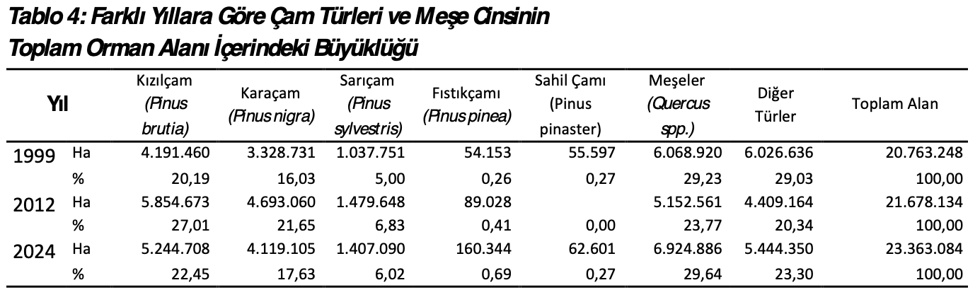 Fidan, dikim ve artım üstünlükleri çamları ağaçlandırmalarda öne çıkarırken, kolay uçan tohumları çamlara terk edilen tarım alanlarını işgal fırsatı vermiştir. Meşelerin payı 2012’de %23,34’e düşse de, 2024’de % 29,30’a yükselmiştir. Fidan üretimi düşen meşelerdeki bu artışın kırsaldaki yakacak ve otlatma baskısının azalışından kaynaklanması olasıdır.