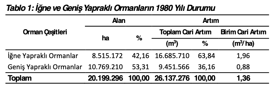 Türkiye’de 1917’de başlayan orman planlaması 1973’de bitmiş, ilk sağlıklı veriler alınmıştır. 1980’de 20.199.296 ha ormanın % 53,31’i meşe, kayın, gibi geniş yapraklı, % 42,16’sı ise çam, göknar gibi iğne yapraklı, ibreli ağaçlardan oluşmuştur. Toplam 26.137.277 m3/yıl artımın, %36,16’sını (0,88 m3/ha) geniş yapraklılar yapıyordu.