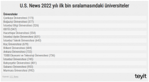 U.S. News 2022-2023 dünya üniversiteleri sıralamasında ilk 500'de Çankaya 173'üncü, Boğaziçi Üniversitesi 377'nci sırada olmak üzere iki üniversite yer alıyor. İlk binde yer alan diğer sekiz üniversite şöyle: