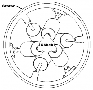 Birçok örneği yapılmış olduğu için patent dışında tutulan motor, resimdeki gibi düşünülebilir: önce stator kısmı (yukarıdaki “Stator”un üzerine eklenmiş olarak). Burada sargılar var, bunlara elektrik bağlantıları olacak, statorun dönmemesi, doğrudan tel ile bağlantı olanağı sağlıyor.