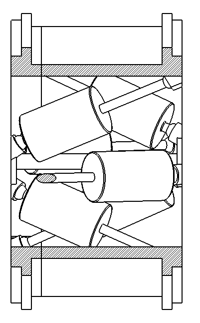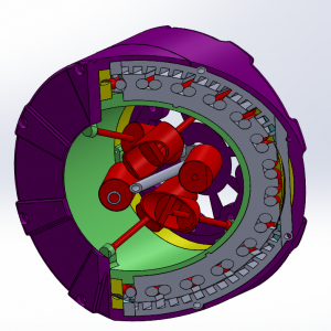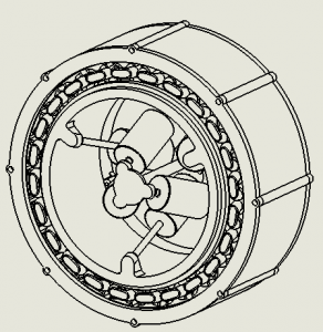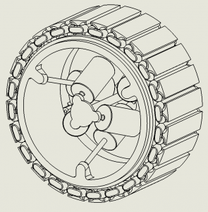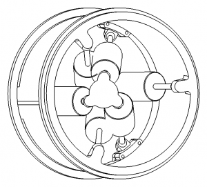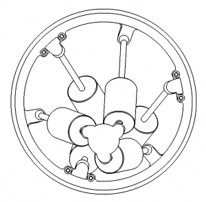 Tekerleğin göbeğini oluşturan ve onu aracın gövdesine bağlayan bir çubuk düşünün (Göbek). Bunu dönmeyecek şekilde aracın gövdesine bağlayın. Geometriden hatırlayacağınız bir kural vardır: üç nokta bir düzlemi belirler, tamamen, eksiksiz olarak tanımlar. Bu göbeğin iç tarafında olan yüzüne üç; dış taraftaki yüzüne de üç, altı tane hidrolik silindir bağlayın. Bağlantıları, küresel olarak hareket edebilir olsun. Silindirlerin pistonlarını da motorun duran kısmınım (Stator) üzerinde gene küresel olarak hareket edebilen mafsallarla karşı yüzlere monte edin. Göbeğin iç yüzündeki silindirin pistonu statorun dış yüzüne; göbeğin dış yüzündeki silindirin pistonu statorun iç yüzüne gelecek şekilde, çapraz. Böylece silindirlerin yükleri karşılaması daha kolay oluyor.