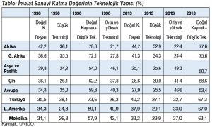 Türkiye’nin 1990 yılında %35,5 olan doğal kaynağa dayalı katma değer payı, 2013 yılında %40,2’ye yükselmiş. Düşük teknolojilerin payı ise %38,1’den %27,1’e düşmüş. Eğer “orta ve yüksek” teknoloji yoğunluklu sektör kategorisi, teknolojik karmaşıklık yapısına göre “orta” ve “yüksek” olarak ayrıştırılsa idi, yüksek teknoloji yoğunluklu sektörlerin katma değer payının son derece marjinal kaldığı görülecekti. Diğer yandan, imalat sanayinde, doğal kaynağa dayalı sektör kategorisine, düşük teknoloji yoğunluklu sektör kategorisi eklendiğinde, düşük teknoloji yoğunluklu sektörlerin payı (2013 yılında) %67,3 gibi yüksek bir orana yükselmektedir.