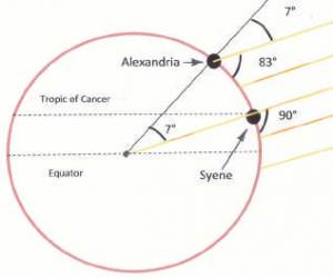 En önemli aletimiz olan çubuğumuz ise, aynı gün, aynı saatte Eratosten tarafından İskenderiye’de yere çakıldı ve boyu ile gölgesinin uzunlukları ölçüldü. O zamanın trigonometri bilgileri yardımı ile (gölgenin boyu / çubuğun boyu = açının tanjantı), Eratosten, güneşin ışınlarının İskenderiye’ye 7 derecelik bir açı ile geldiğini hesapladı. Ayrıca, eski yunanlılar, güneşin dünyaya çok uzakta olduğunu ve ışınlarının o nedenle birbirlerine paralel olarak geldiklerini biliyorlardı. O nedenle, ve yandaki şekilde görüldüğü gibi, iki paraleli kesen bir doğrunun (dünyanın İskenderiyeye varan yarıçapının) onlarla aynı açıyı yaptığı da bilindiğinden, yerküre üzerindeki her iki şehrin arasındaki açının da 7 derece olduğu sonucu çıkıyordu.