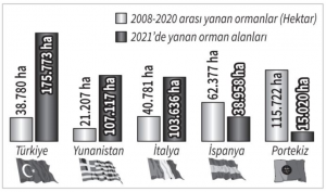 Yukarıdaki grafikte, bazı Akdeniz ülkelerinde orman yangınlarının yok ettiği alanları görüyorsunuz. Türkiye bu yıl rekor kırdı. 2008-2020 arasında, sadece 12 yıl içinde 38 bin 780 hektar orman yanarken, sadece bu yıl içinde 4.5 katı, 170 bin 773 hektar ormanı kaybettik. Bu bilgiler Avrupa Orman Yangını Bilgi Sistemi’nden alındı. Türkiye ile birlikte bu yıl Yunanistan ve İtalya da yangın ve kayıp rekorları kırmış gözüküyor. Yangınlar için “tarihi büyüklükte” deniyor.